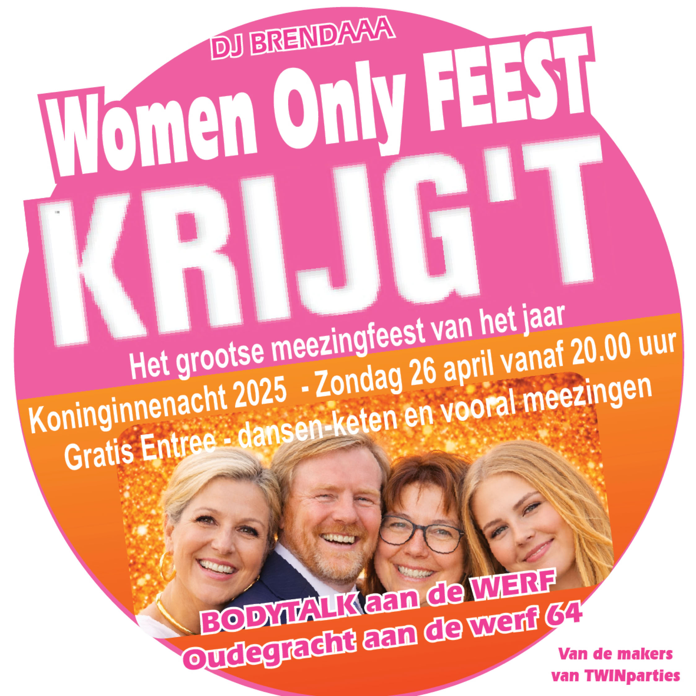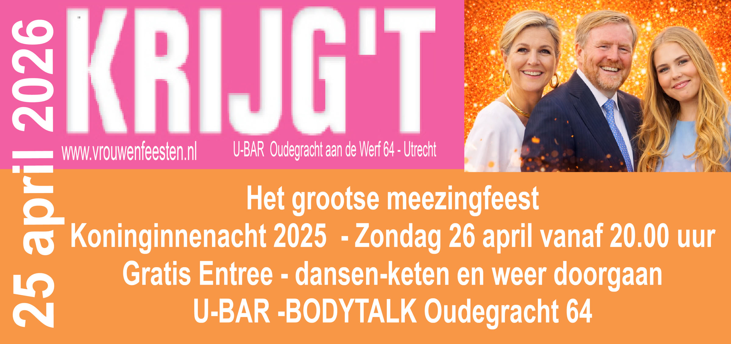 Utrecht heeft net als Den Haag een Koningsnacht. We vieren dit al jaren met een gratis (KRIJG’T) event tijdens de Koningsnacht die dit jaar op Zondag 26 april 2026 valt. Zoals ieder jaar vieren we in de kelder en op de werf van de Bodytalk.