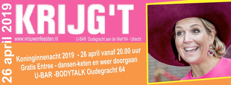Op donderdag 26 april 2018 vieren we voor de 14e keer op rij “het feest der feesten”. KRIJG’T organiseert dan het meest bijzondere en besproken feest van het jaar. Honderden vrouwen weten dan de weg naar de U-BAR te vinden om met elkaar te proosten op onze Koning en zijn prachtige vrouw, elkaar te ontmoeten, te dansen, gek te doen, de nodige drankjes te drinken om vervolgens weer verder te struinen over de vrijmarkt.